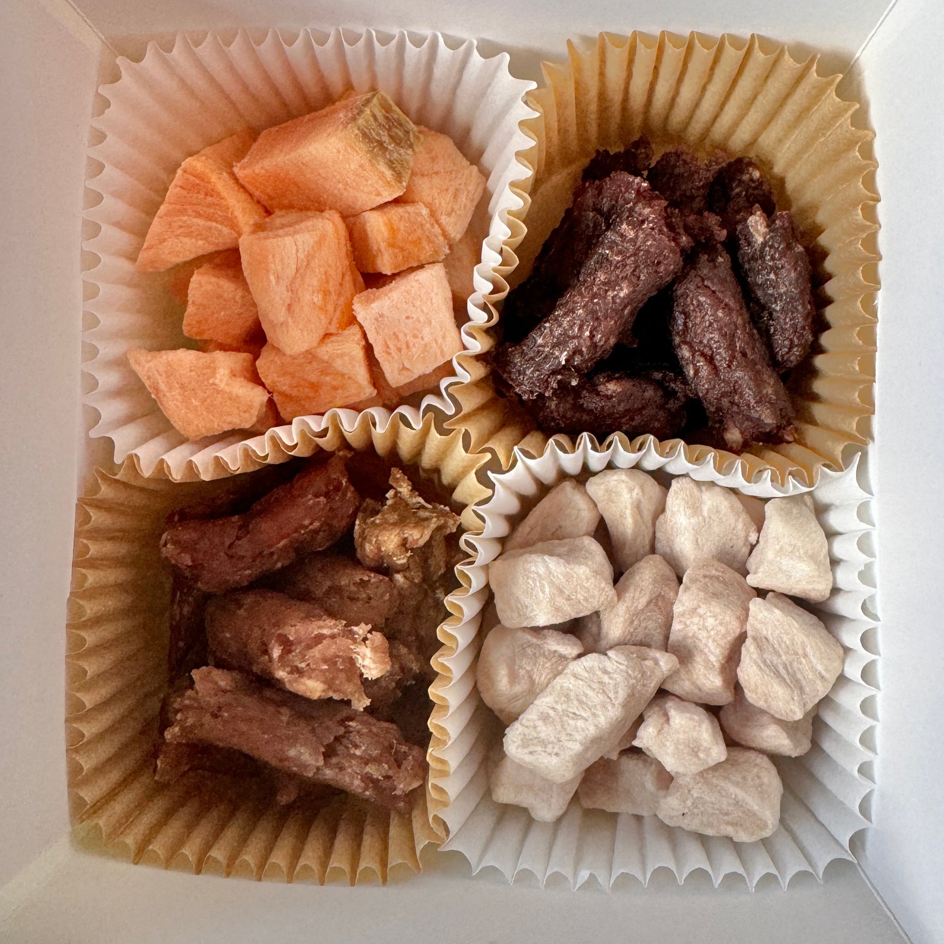 The Details: Each box measures approximately 4"x4"x2.5". You will receive a mix of jerky, break apart, and freeze-dried bites, in a variety of beef, chicken, pork and salmon. There are TWO layers of treats per box, so there's plenty of treats for your pup! Each box comes individually shrink wrapped for freshness. If your pup has a specific allergy or food sensitivity, please make a note in the Order Special Instructions at checkout and we will do our best to accommodate.