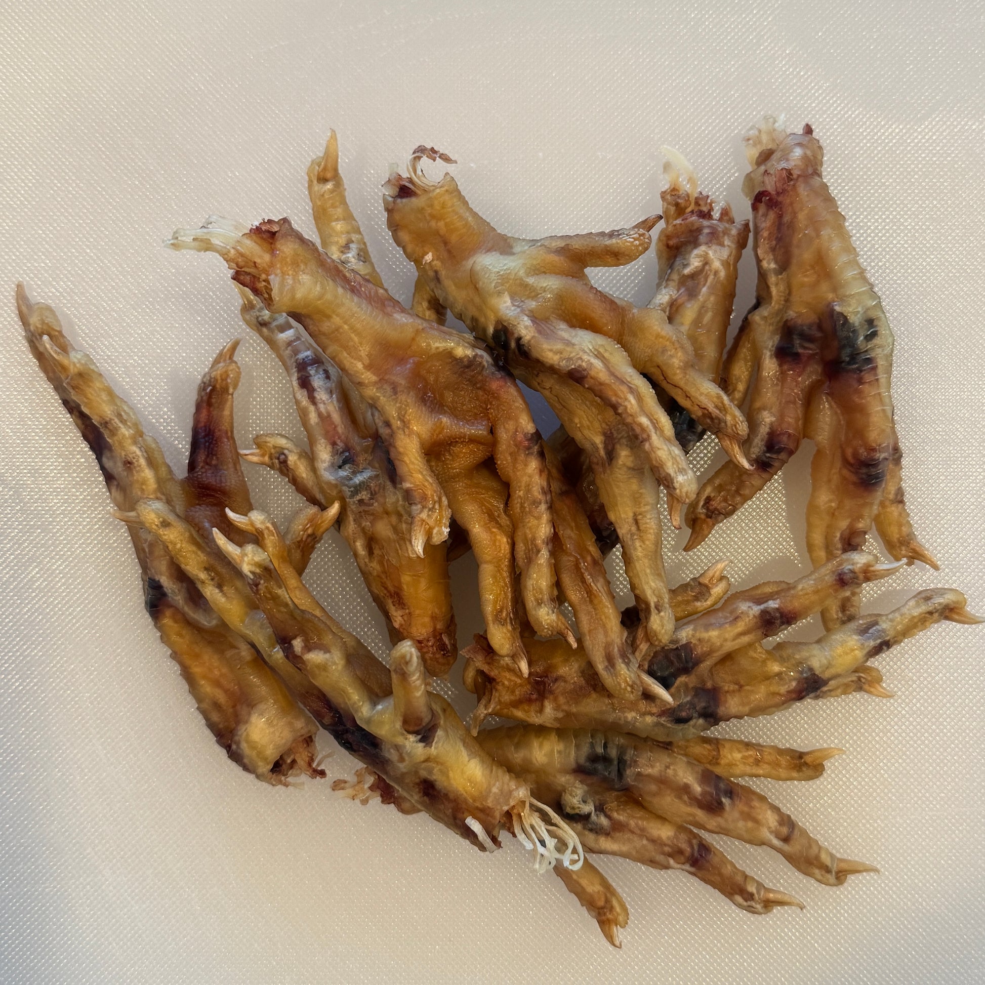 These chews are made in small batches from 100% dehydrated chicken feet. Nutritional benefits include Calcium, Chondroitin, Collagen and Glucosamine, which are all beneficial to strong bones and healthy joints. They help in cleaning your dog's teeth, scraping away plaque and tartar as they chew.